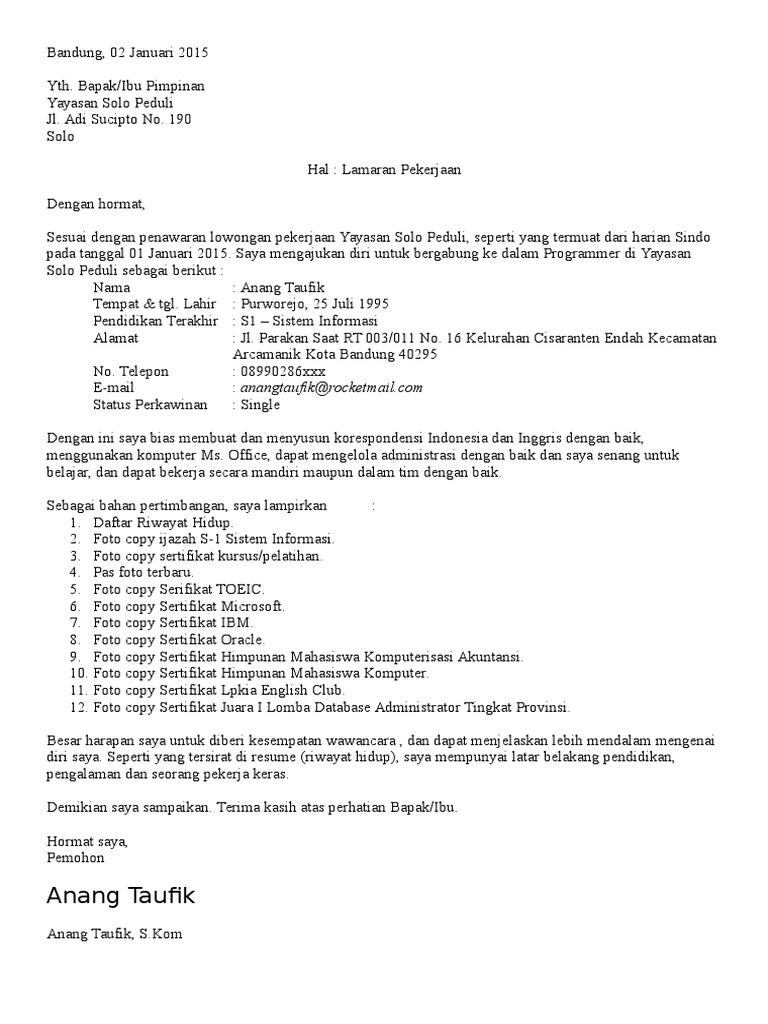 Berikut contoh surat lamaran pekerjaan terbaru 2019 resmi yang baik dan benar dengan format formal yang bisa anda unduh untuk melamar di perusahaan bumn. Tersedia dalam bahasa indonesia dan bahasa inggris. Berikut ini dapat anda download contoh surat lamaran kerja guru paud, tk, sd, mi, smp, sma, smk, bimbel, yayasan, honorer yang masih kuliah sekalipun berbentuk doc maupun pdf. File mendukung format microsof office word terbaru. Surat lamaran kerja merupakan salah satu syarat untuk mendapatkan pekerjaan yang ingin anda dapatkan. Anda bisa mendownload file surat lamaran kerja doc melaluitautan di bawah. Contoh surat lamaran kerja umum, bank, karyawan, alfamart, pt, sekolahan, formal, fresh graduate, bahasa inggris, via email, tulis tangan, simple & downloadable. Selamat datang di semuasurat.blogspor.com, selamat membaca dan semoga bermanfaat. Cara membuat surat lamaran kerja harus ditulis padat, jelas, dan rinci serta tidak berlebihan. Salam hormat ketika menuliskan surat lamaran dalam bentuk doc maka anda jangan lupa menuliskan salam hormat yaitu ucapan pembukaan yang bisa berupa salam. Jika anda ingin melamar pekerjaan di bank, maka anda bisa menulis contoh surat lamaran kerja doc seperti di bawah ini. Juli 10, 2021juni 2, 2021 oleh isnanisha karlina. Apakah anda memerlukan lamaran dalam bahasa inggris atau bahasa indonesia?